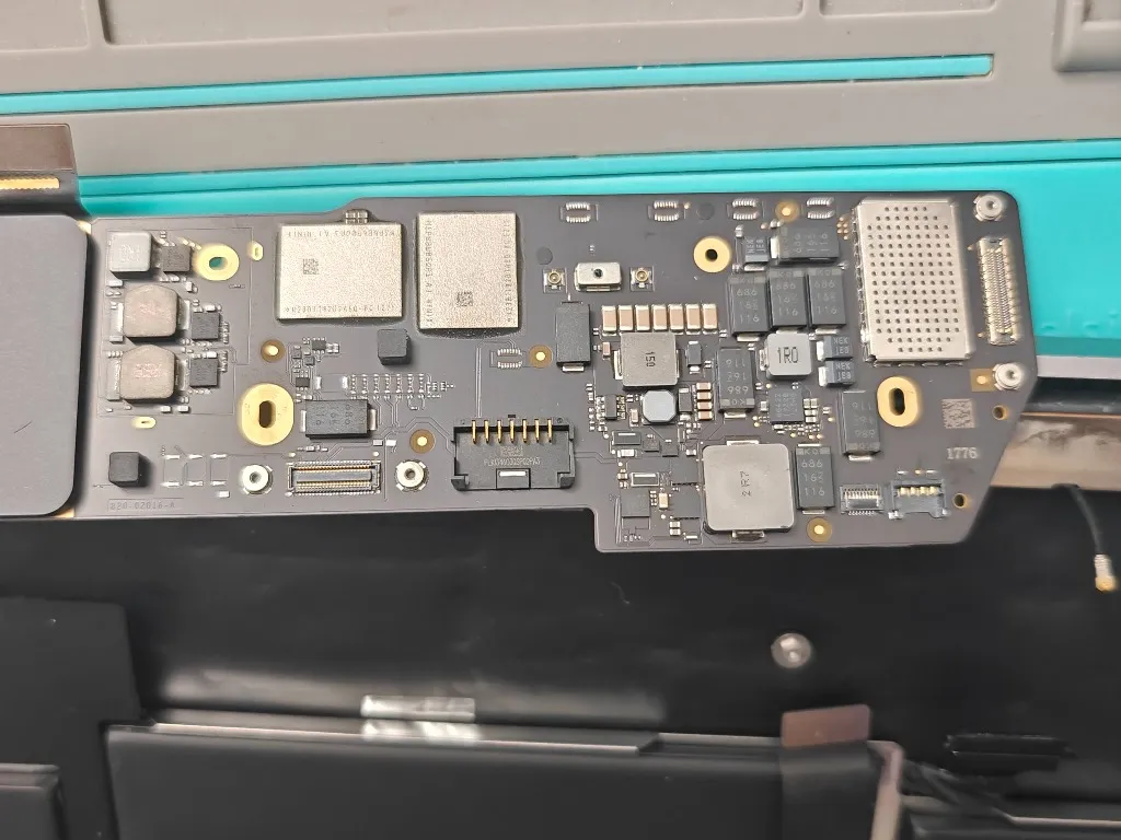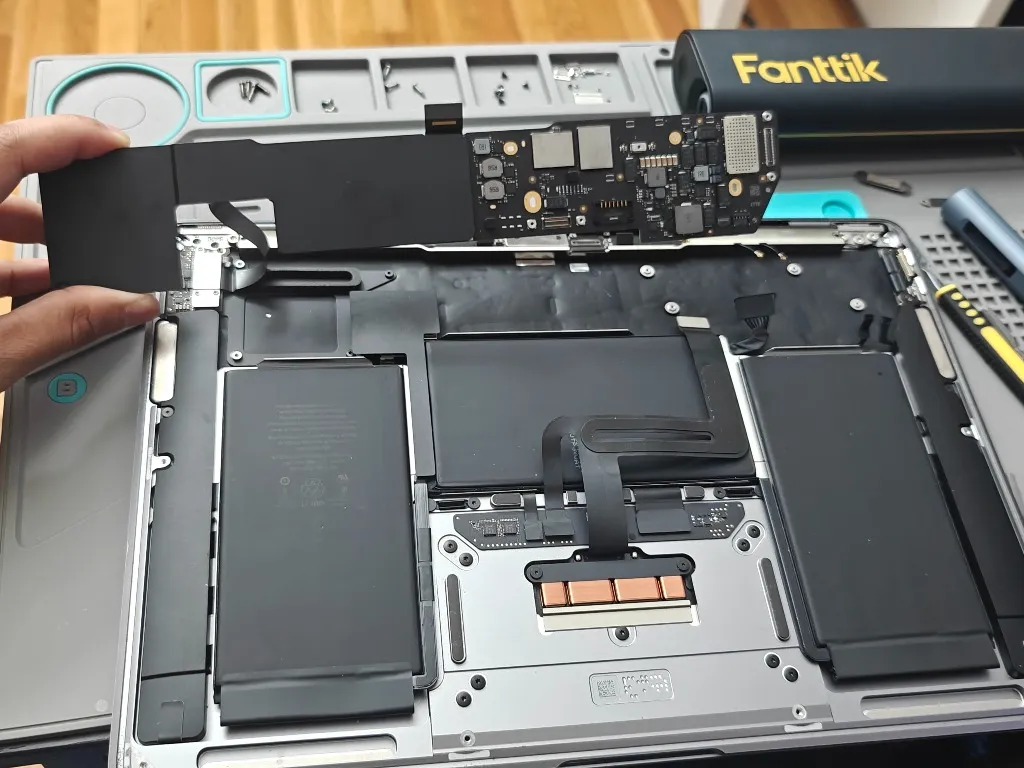 The logic board is remarkably compact. Disconnect the battery first, then the various ribbon cables. A few screws hold it in place. The flex cable to the trackpad is delicate - take care.